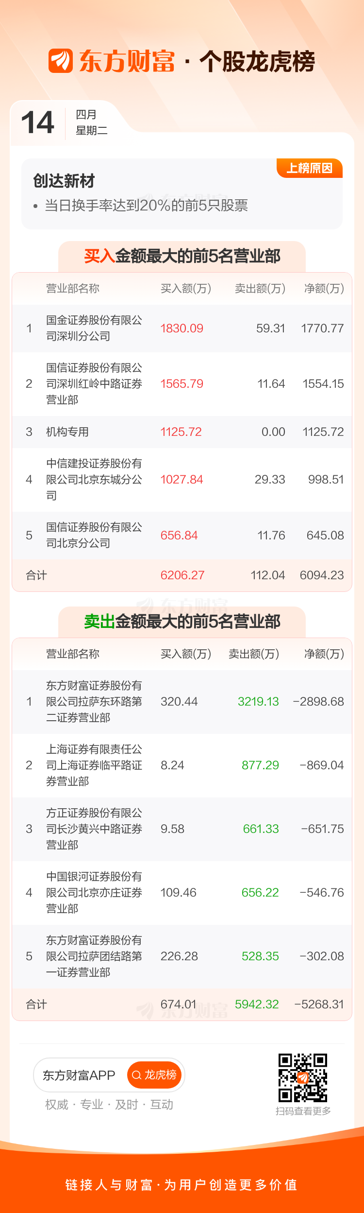 交易所2026年4月14日公布的交易公开信息显示,创达新材因成为当日换手率达到20%的前5只股票上榜。创达新材当日收报50.71元,涨跌幅-1.86%,偏离值62.52%,换手率62.52%,成交额4.10亿。