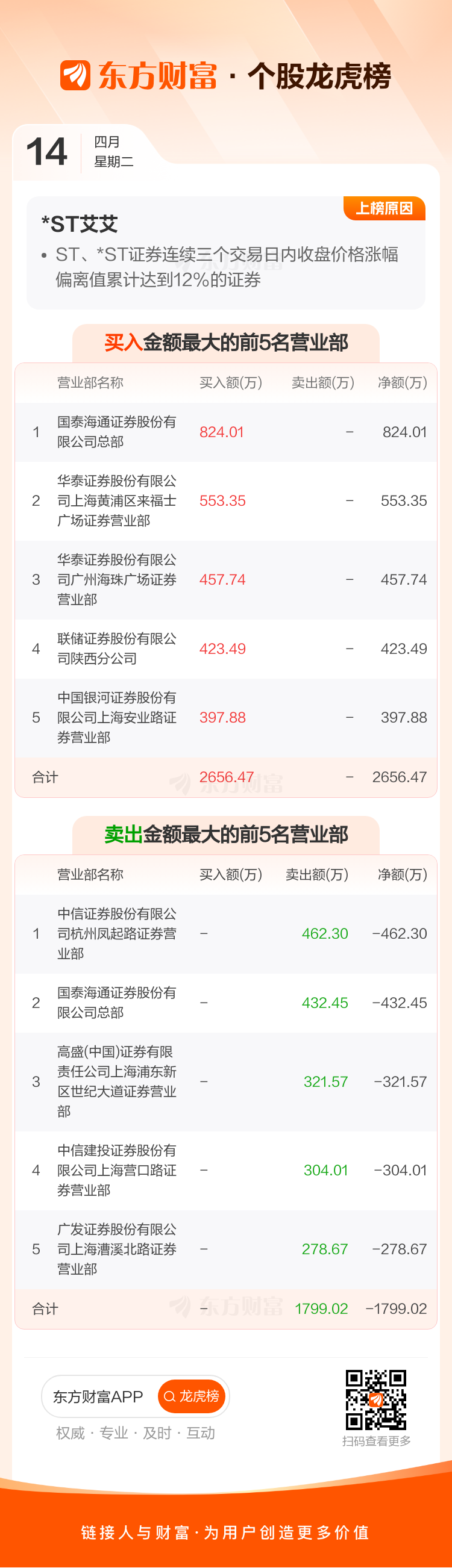 交易所2026年4月14日公布的交易公开信息显示,*ST艾艾因成为ST、*ST证券连续三个交易日内收盘价格涨幅偏离值累计达到12%的证券上榜。*ST艾艾当日收报19.41元,涨跌幅4.98%,换手率2.67%,成交额6761.68万。异常期间4月10日至4月14日,期间涨幅15.74%,累计偏离值14.22%,区间成交额1.49亿。