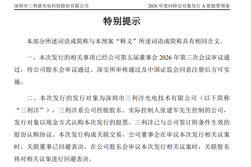 4月13日晚间,公司披露《2026年度向特定对象发行A股股票预案》,公司拟向实际控制人张建军控制的企业深圳市三利沣光电技术有限公司发行不超过2566.50万股,募集资金总额不超过5.5亿元,扣除发行费用后全部用于补充流动资金及偿还银行贷款。