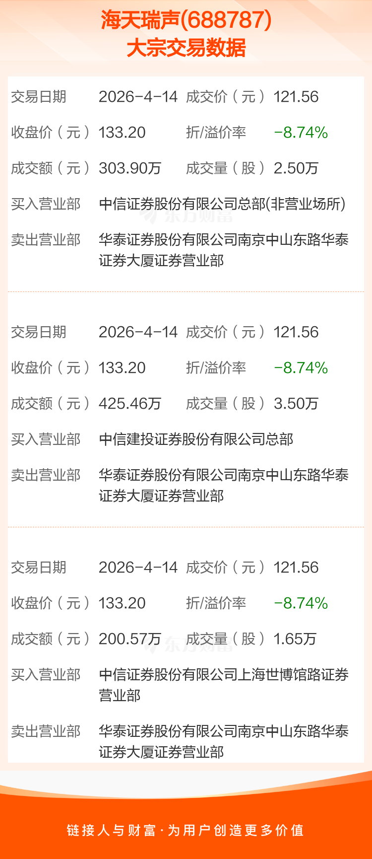 2026年4月14日,海天瑞声发生3笔大宗交易,共成交7.65万股,成交金额929.93万元,占其流通市值比例为0.12%。