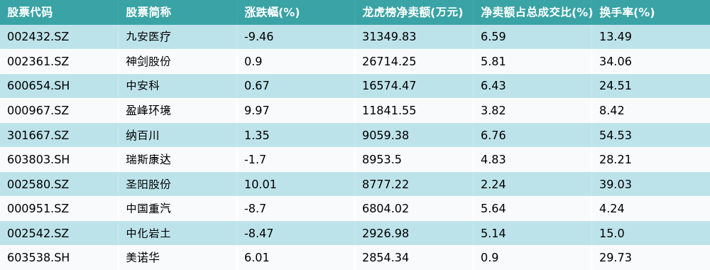 南财智讯4月14日电,盘后数据显示,因当日异动登上龙虎榜的个股中,龙虎榜中资金净流出最多的前三位分别是九安医疗(002432.SZ)、神剑股份(002361.SZ)与中安科(600654.SH)。其中排名第一的九安医疗被净卖出3.13亿元,占总成交金额的6.59%。九安医疗收盘下跌9.46%,换手率为13.49%。净卖出额前10个股详情见下图: