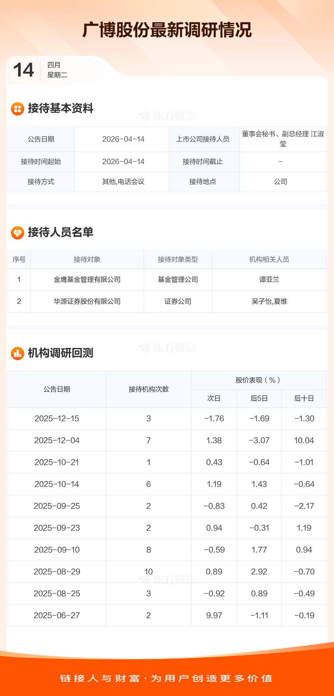 广博股份4月14日公告称,4月14日接待金鹰基金管理有限公司等2家机构调研。接待人员包括董事会秘书、副总经理 江淑莹。