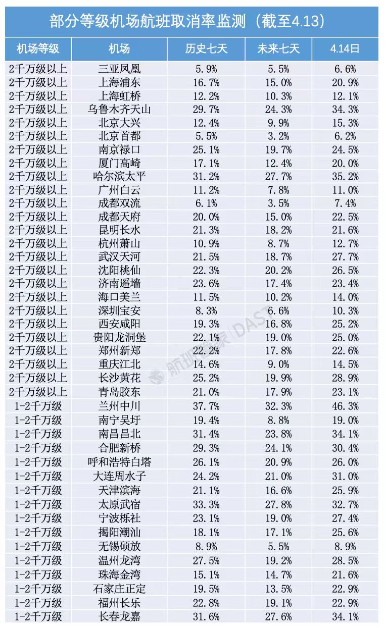 航班管家DAST数据显示,截至4月13日,未来七天我国民航客运航班量取消率达14.6%,随着时间推移,航班取消率可能仍会持续上升。截至目前,兰州、哈尔滨、乌鲁木齐等机场取消率显著高于全国平均水平。