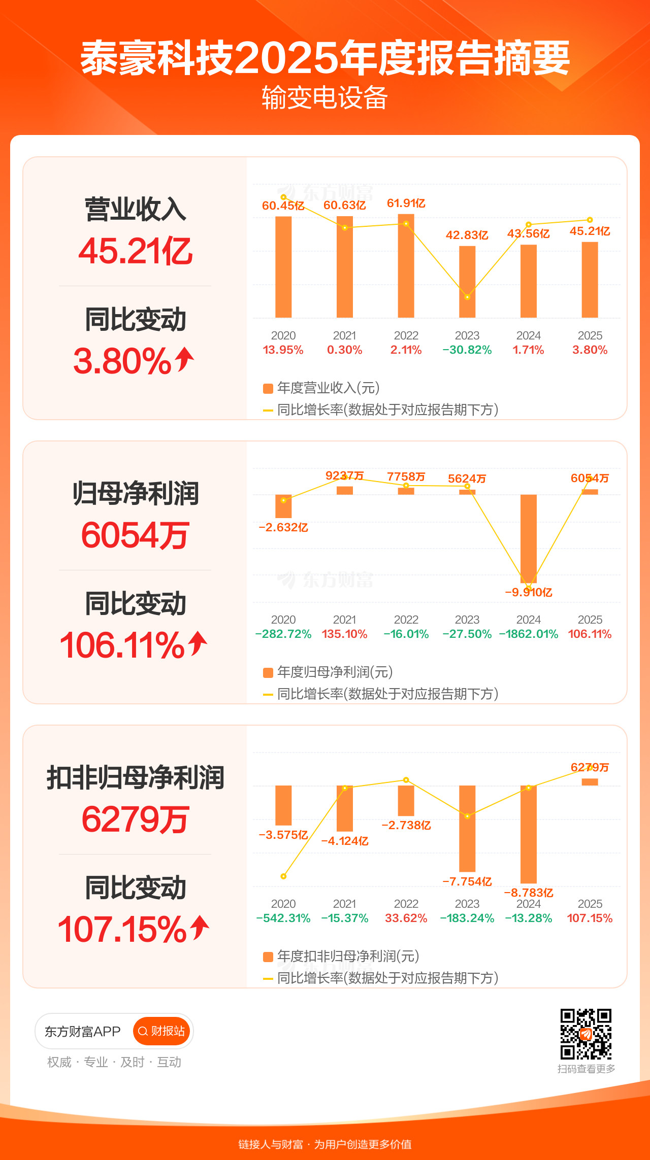 泰豪科技4月15日发布2025年年报显示,公司全年实现营业收入45.21亿元,同比增长3.80%;归母净利润6053.71万元,同比增长106.11%;扣非归母净利润6278.51万元,同比增长107.15%。