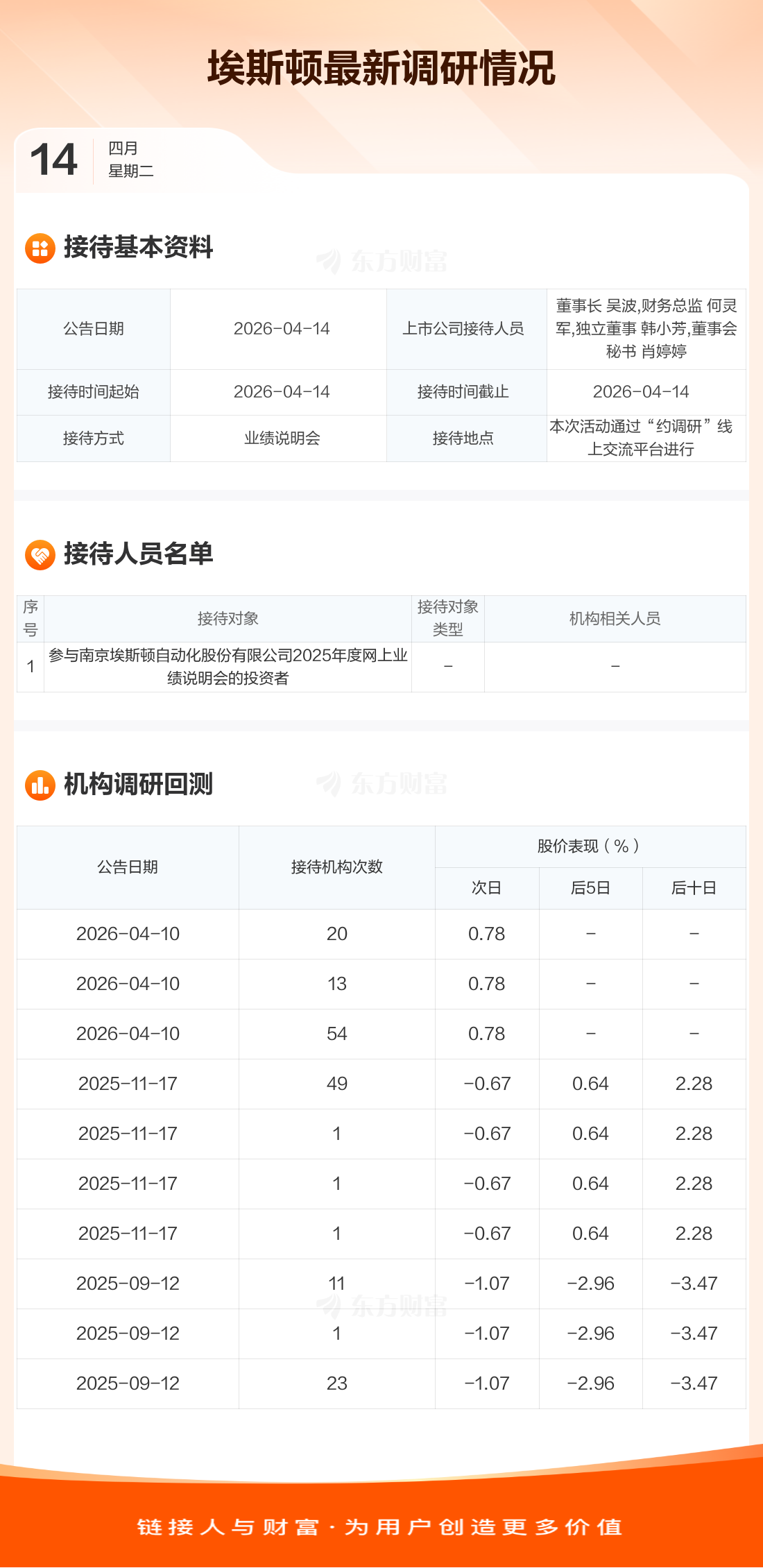 埃斯顿4月14日公告称,4月14日接待参与南京埃斯顿自动化股份有限公司2025年度网上业绩说明会的投资者调研。接待人员包括董事长 吴波,财务总监 何灵军,独立董事 韩小芳,董事会秘书 肖婷婷。