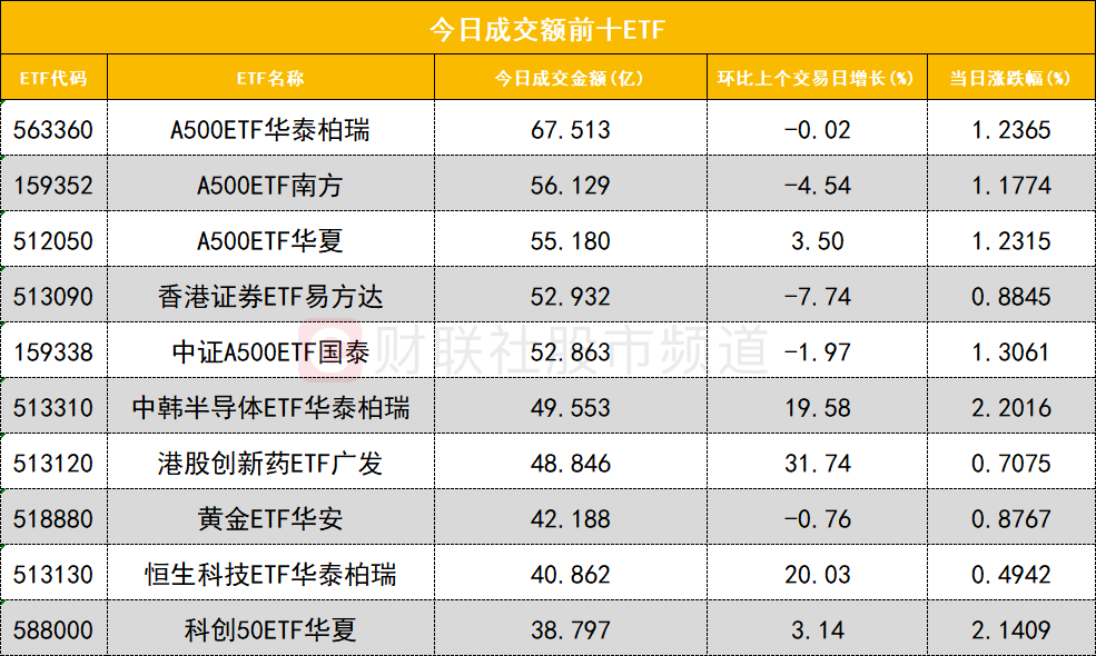 从成交额前十的ETF来看,A500ETF华泰柏瑞(563360)成交额位居首位,A500ETF南方(159352)成交额位居次席。