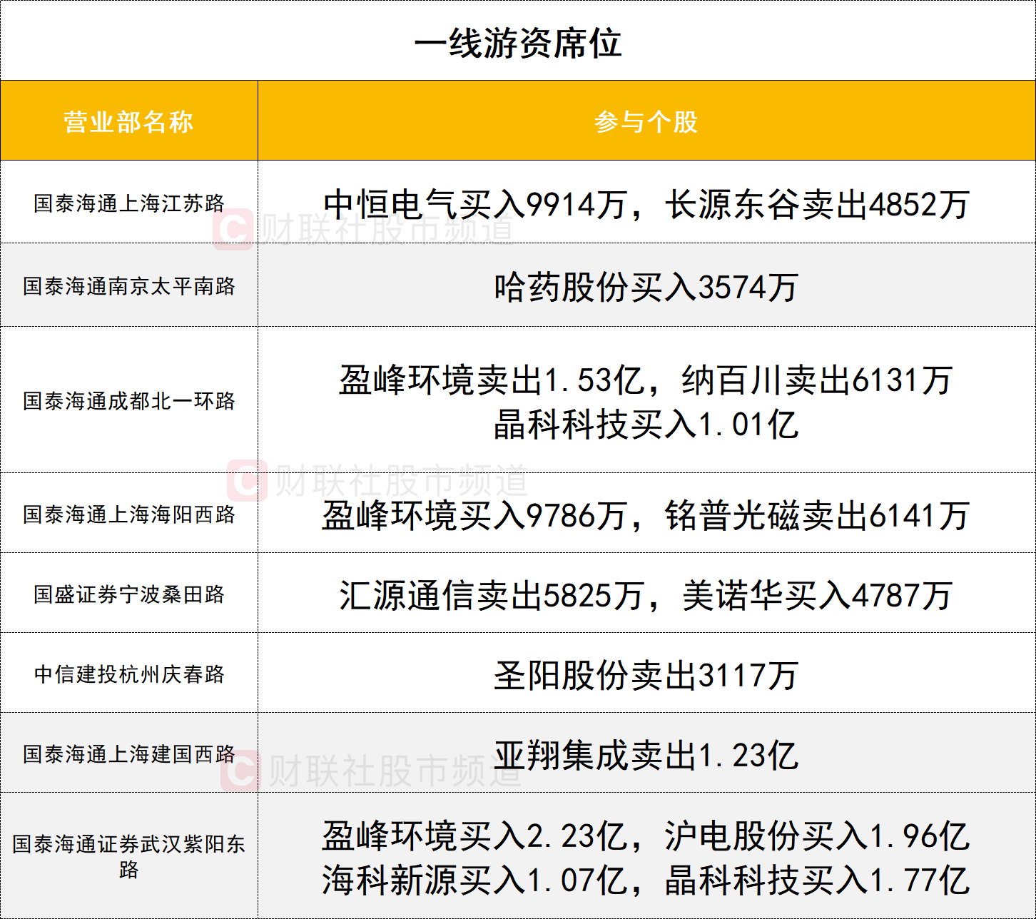 一线游资活跃度较高,沪电股份今日涨停创历史新高,获一家一线游资(国泰海通证券武汉紫阳东路)买入1.96亿,同时深股通买入2.02亿。游资扎堆盈峰环境,获两家游资(国泰海通证券武汉紫阳东路、国泰海通上海海阳西路)合计买入3.2亿,同时一家游资(国泰海通成都北一环路)卖出1.53亿。