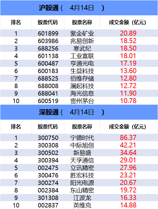 从沪股通前十大成交个股来看,紫金矿业位居首位;兆易创新和寒武纪分居二、三位。