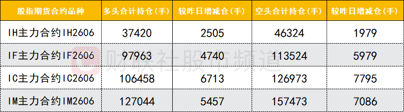 四大期指主力合约多空双方均加仓,IF、IM合约空头加仓数量较多。