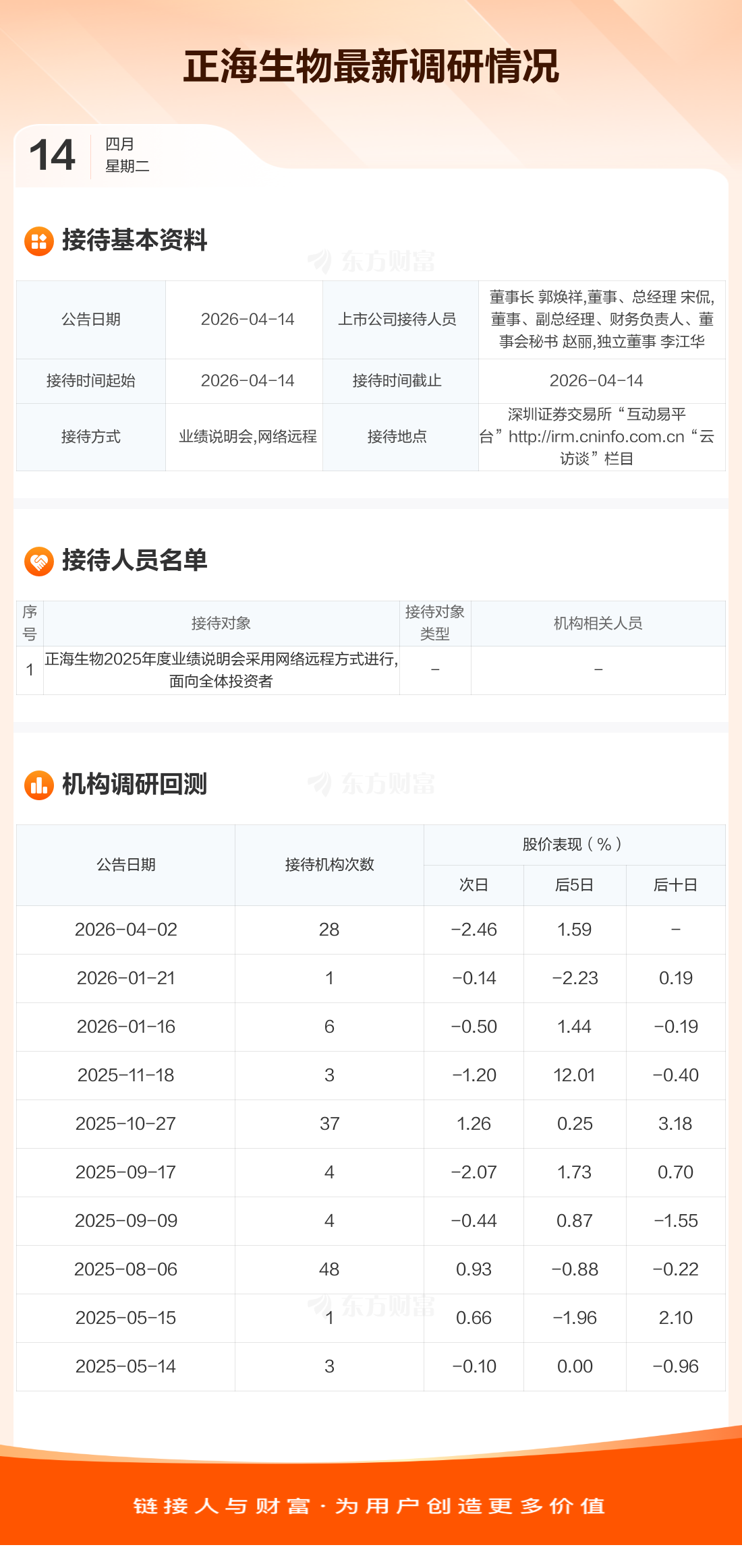 正海生物4月14日公告称,4月14日接待正海生物2025年度业绩说明会采用网络远程方式进行,面向全体投资者调研。接待人员包括董事长 郭焕祥,董事、总经理 宋侃,董事、副总经理、财务负责人、董事会秘书 赵丽,独立董事 李江华。