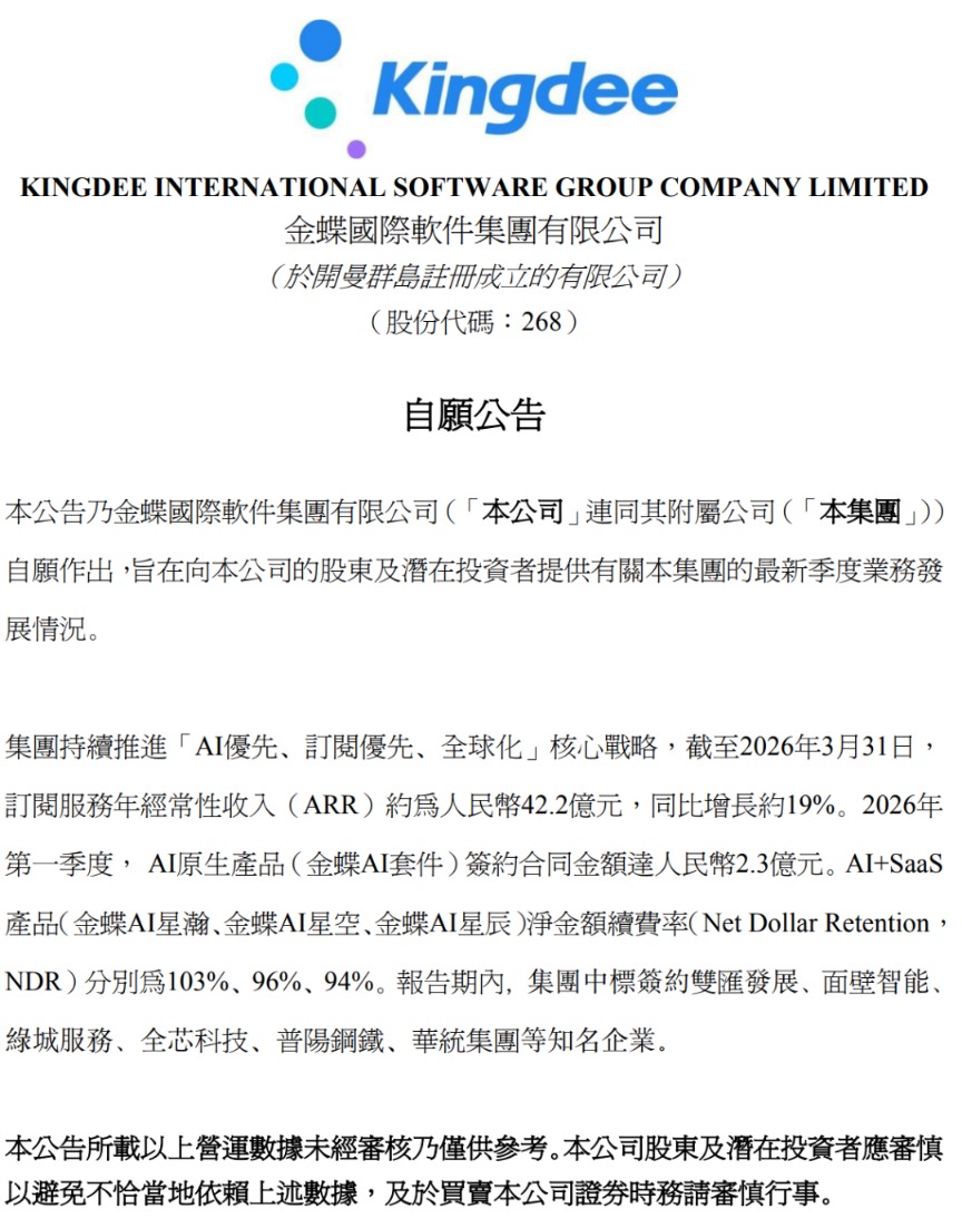 4月13日,金蝶国际发布自愿公告称,集团持续推进“AI优先、订阅优先、全球化”核心战略,截至2026年3月31日,订阅服务年经常性收入(ARR)约为42.2亿元,同比增长约19%。AI原生产品“金蝶AI套件”于2026年第一季度签约合同金额达2.3亿元,显示出AI产品商业化进程加速。AI+SaaS产品线表现稳健,金蝶AI星瀚、金蝶AI星空、金蝶AI星辰的净金额续费率(NDR)分别为103%、96%、94%,反映出客户黏性高、续约能力良好。