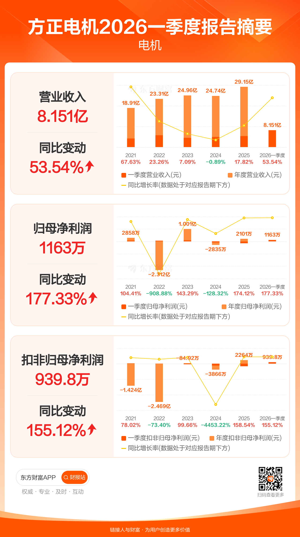 方正电机4月15日发布2026年一季报显示,公司一季度实现营业收入8.15亿元,同比增长53.54%;归母净利润1162.82万元,同比增长177.33%;扣非归母净利润939.84万元,同比增长155.12%。