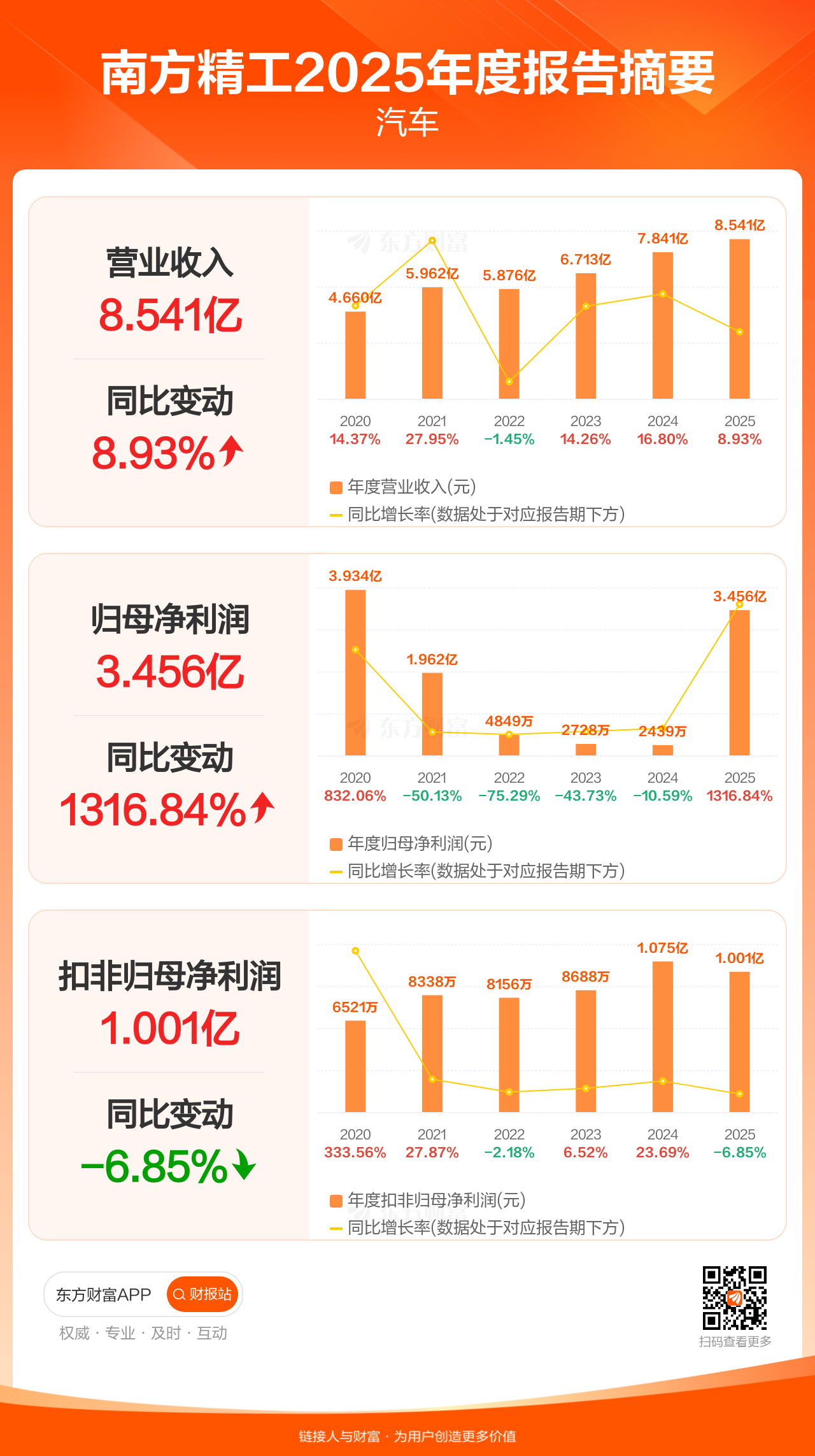 南方精工4月15日发布2025年年报显示,公司全年实现营业收入8.54亿元,同比增长8.93%;归母净利润3.46亿元,同比增长1316.84%;扣非归母净利润1.00亿元,同比下滑6.85%。