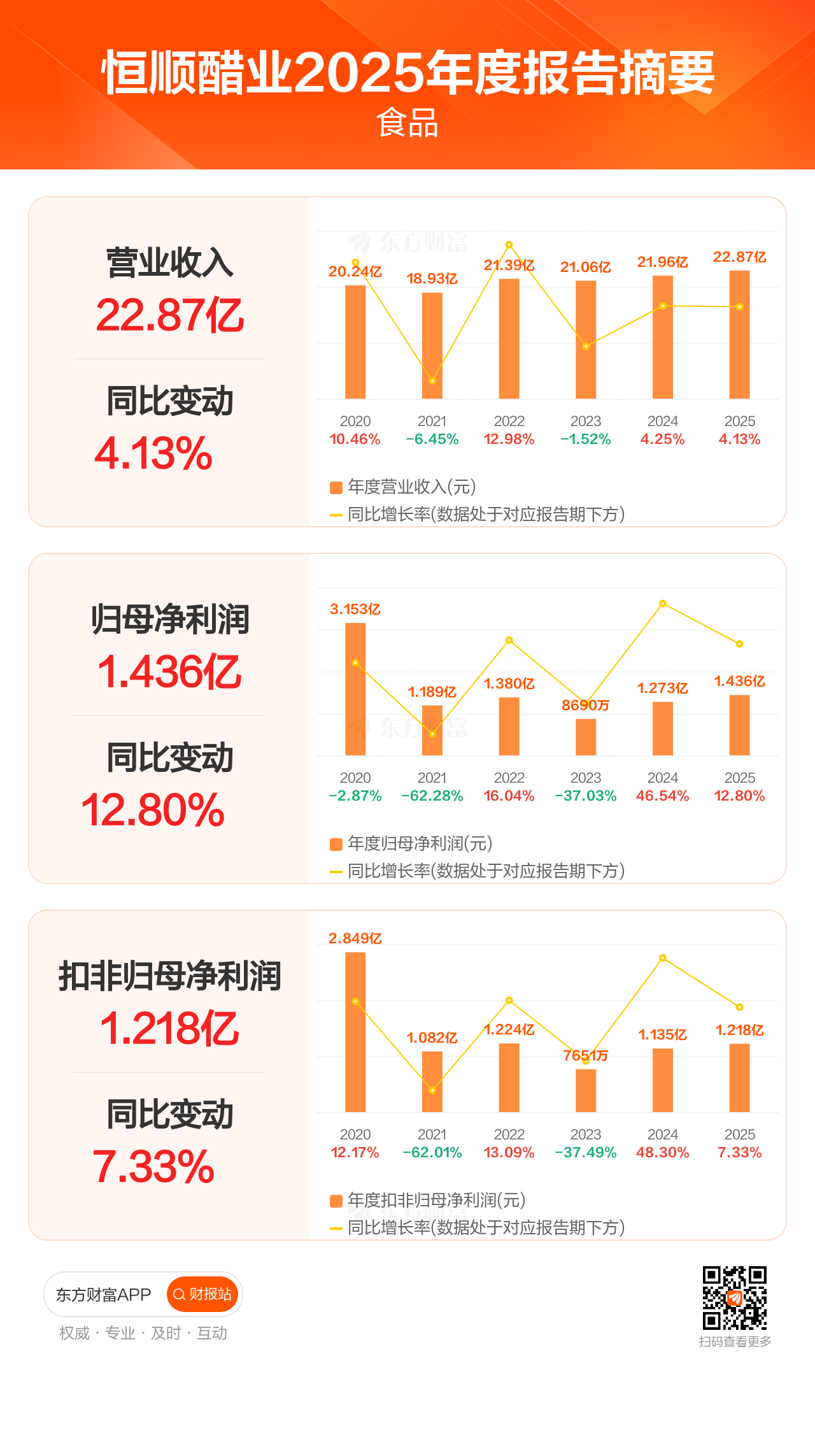 恒顺醋业4月15日发布2025年年报显示,公司全年实现营业收入22.87亿元,同比增长4.13%;归母净利润1.44亿元,同比增长12.80%;扣非归母净利润1.22亿元,同比增长7.33%。