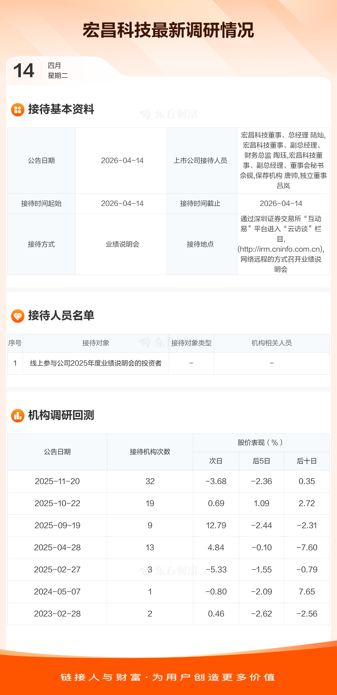 宏昌科技4月14日公告称,4月14日接待线上参与公司2025年度业绩说明会的投资者调研。接待人员包括宏昌科技董事、总经理 陆灿,宏昌科技董事、副总经理、财务总监 陶珏,宏昌科技董事、副总经理、董事会秘书 佘砚,保荐机构 唐帅,独立董事 吕岚。