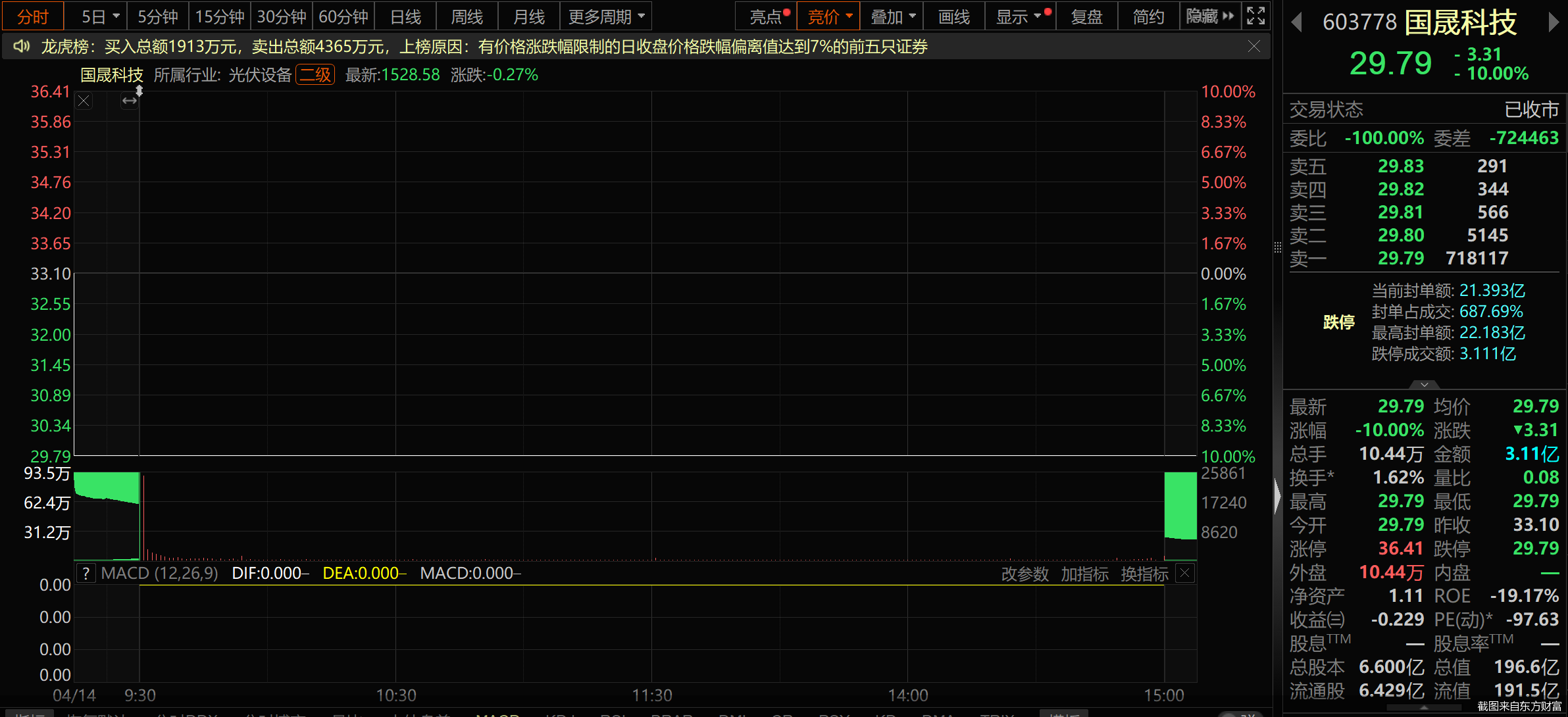 4月14日,国晟科技开盘跌停,全天未能打开跌停板,当日收于跌停价29.79元/股,总市值196.6亿元。