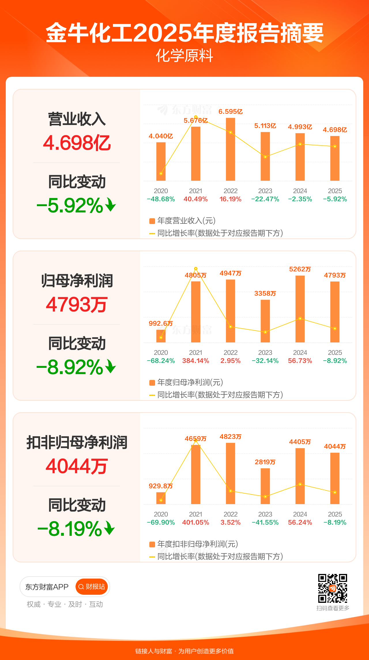 金牛化工4月15日发布2025年年报显示,公司全年实现营业收入4.70亿元,同比下滑5.92%;归母净利润4792.79万元,同比下滑8.92%;扣非归母净利润4043.73万元,同比下滑8.19%。