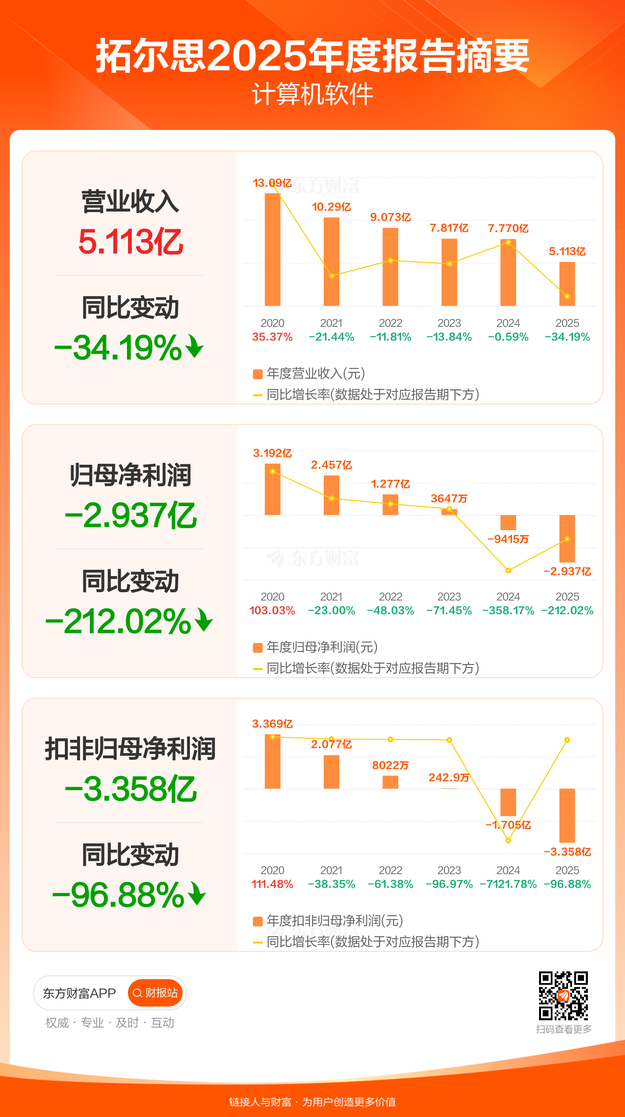拓尔思4月15日发布2025年年报显示,公司全年实现营业收入5.11亿元,同比下滑34.19%;归母净利润-2.94亿元;扣非归母净利润-3.36亿元。