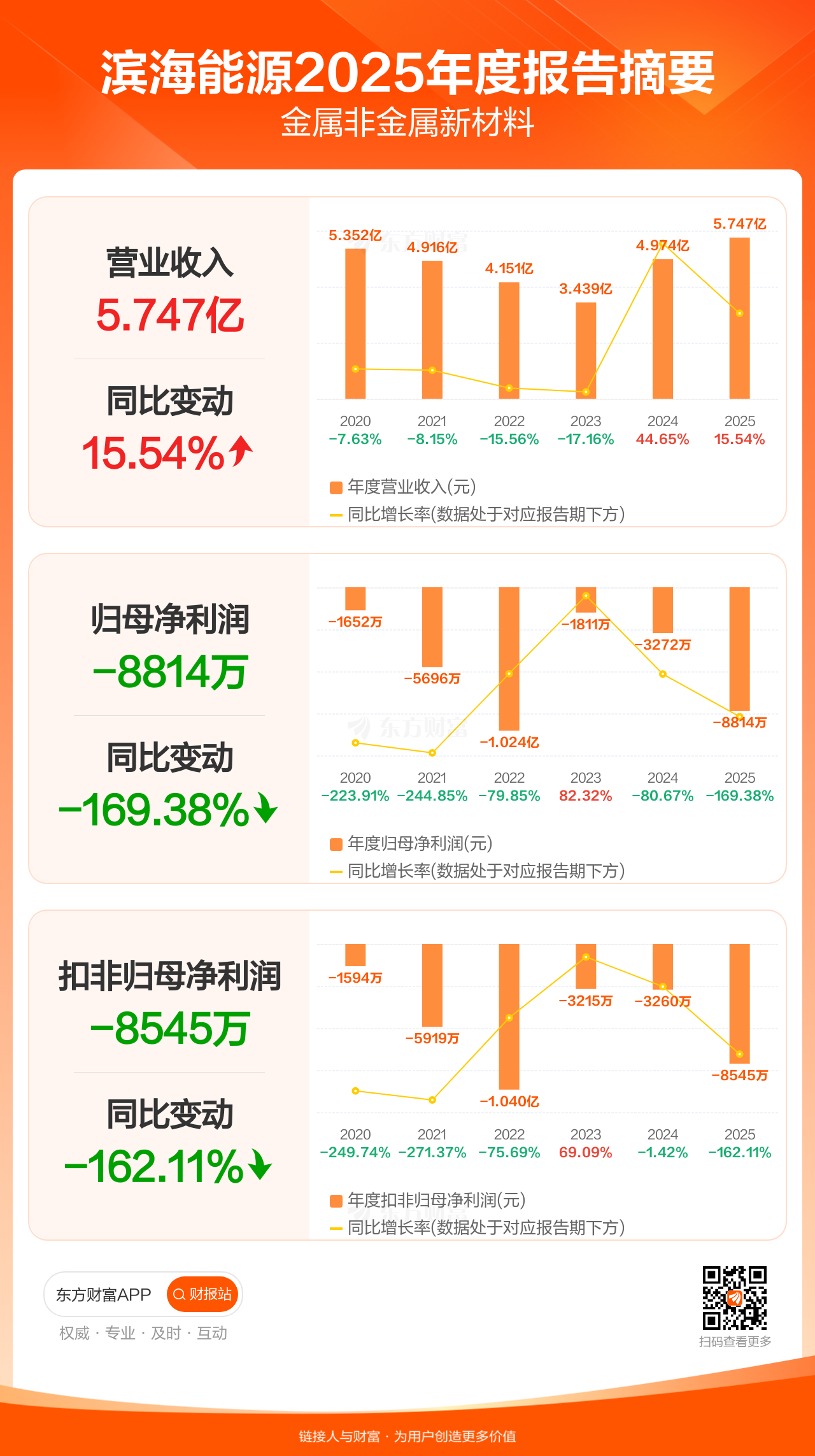 滨海能源4月15日发布2025年年报显示,公司全年实现营业收入5.75亿元,同比增长15.54%;归母净利润-8813.61万元;扣非归母净利润-8545.38万元。