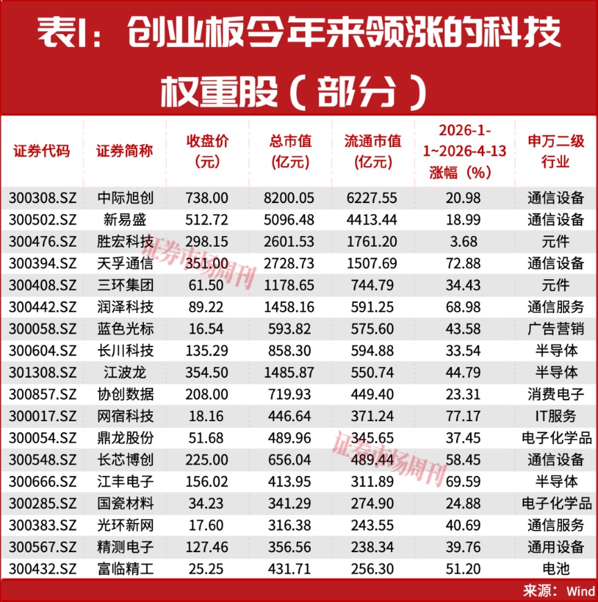 在稳健的基本盘之上,创业板走势明显强于主板,这与中际旭创等权重股的带动直接相关,而它们很多又与光通信、CPO等AI算力硬科技有关(见表1)。