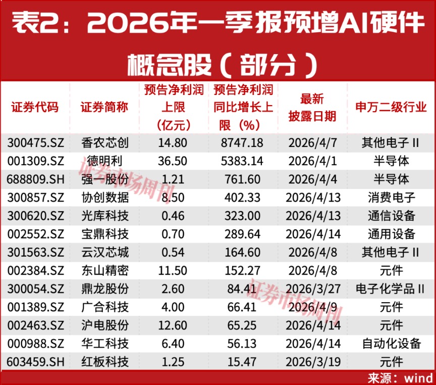 当前,AI算力硬件加速兑现,是产业逻辑景气度的进一步印证,除了上面的提到的德明利,一众标的一季报业绩超预期增长,如协创数据等(见表2),公司4月13日预告称,一季报最高预增402.33%,股价4月14日直接斩获“20cm”涨停。