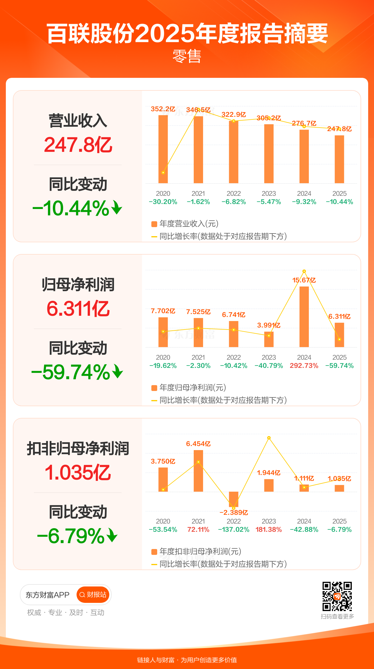 百联股份4月15日发布2025年年报显示,公司全年实现营业收入247.85亿元,同比下滑10.44%;归母净利润6.31亿元,同比下滑59.74%;扣非归母净利润1.04亿元,同比下滑6.79%。