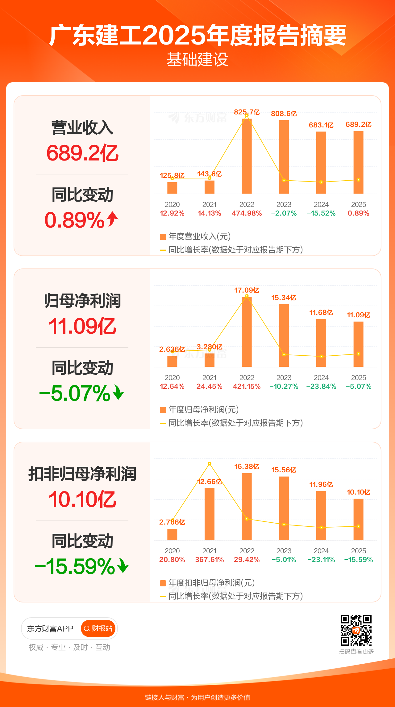 广东建工4月15日发布2025年年报显示,公司全年实现营业收入689.20亿元,同比增长0.89%;归母净利润11.09亿元,同比下滑5.07%;扣非归母净利润10.10亿元,同比下滑15.59%。