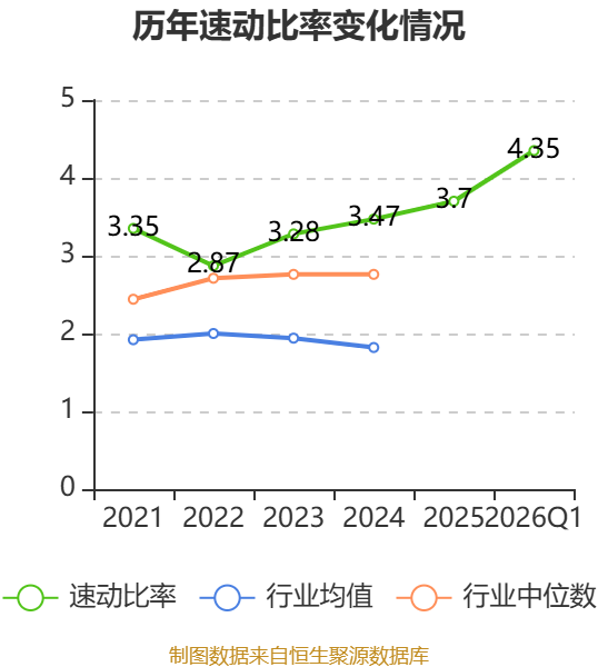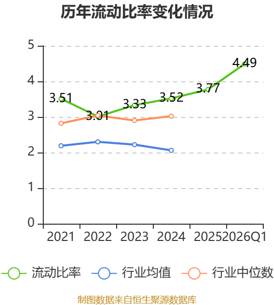 2026年第一季度,公司流动比率为4.49,速动比率为4.35。