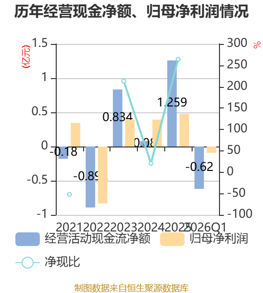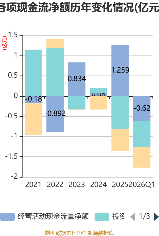 截至2026年一季度末,公司经营活动现金流净额为-6201.47万元,同比减少2862.86万元;筹资活动现金流净额-5043.61万元,同比减少1929.87万元;投资活动现金流净额-6435.44万元,上年同期为-1692.74万元。