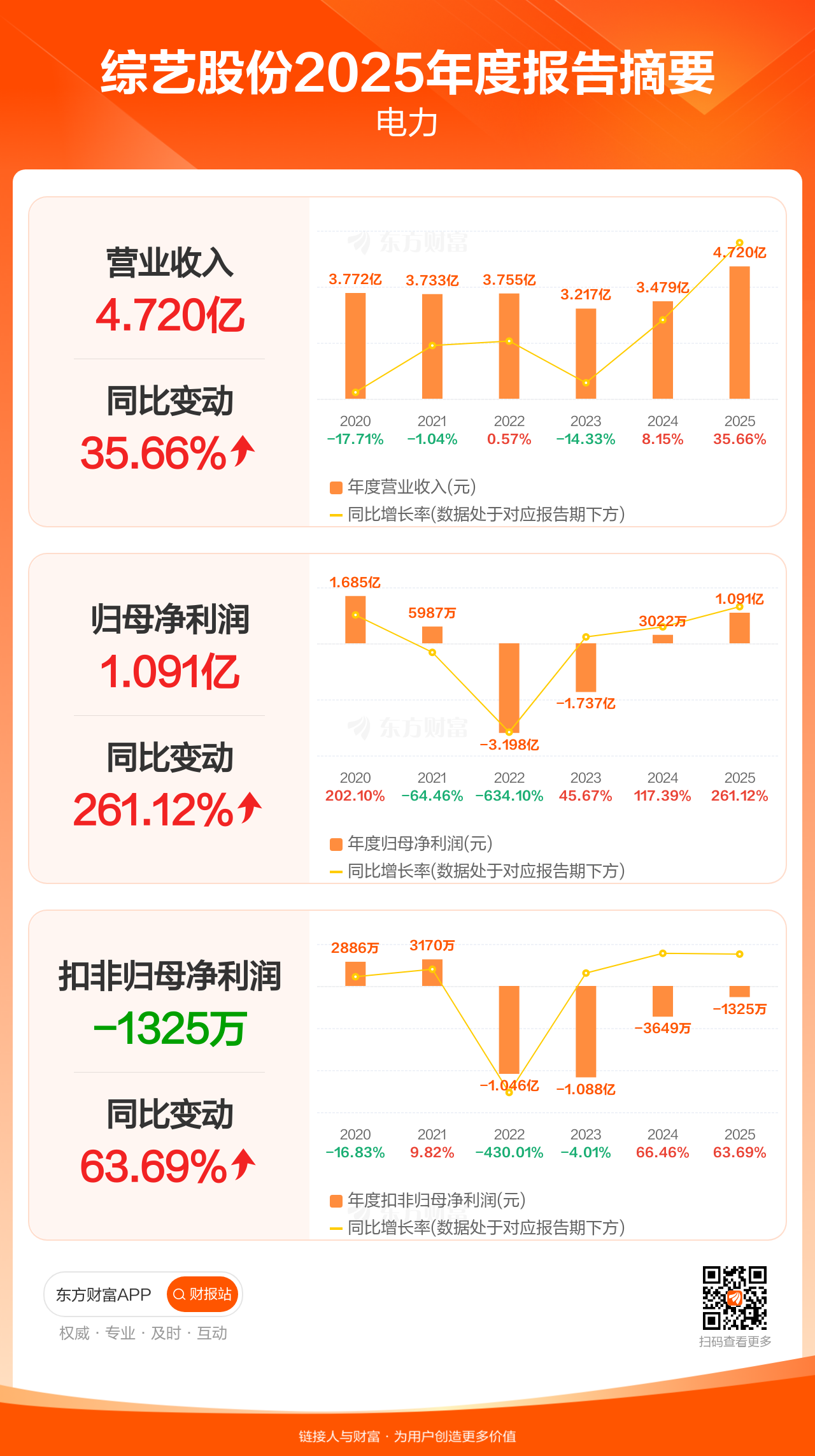 综艺股份4月15日发布2025年年报显示,公司全年实现营业收入4.72亿元,同比增长35.66%;归母净利润1.09亿元,同比增长261.12%;扣非归母净利润-1324.98万元。