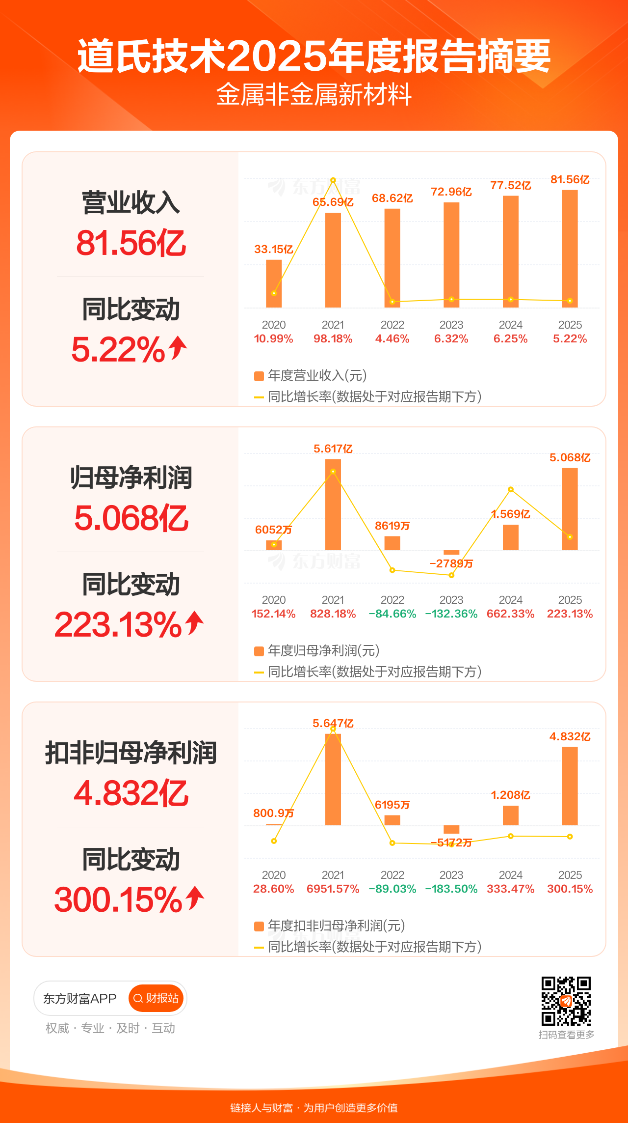 道氏技术4月15日发布2025年年报显示,公司全年实现营业收入81.56亿元,同比增长5.22%;归母净利润5.07亿元,同比增长223.13%;扣非归母净利润4.83亿元,同比增长300.15%。