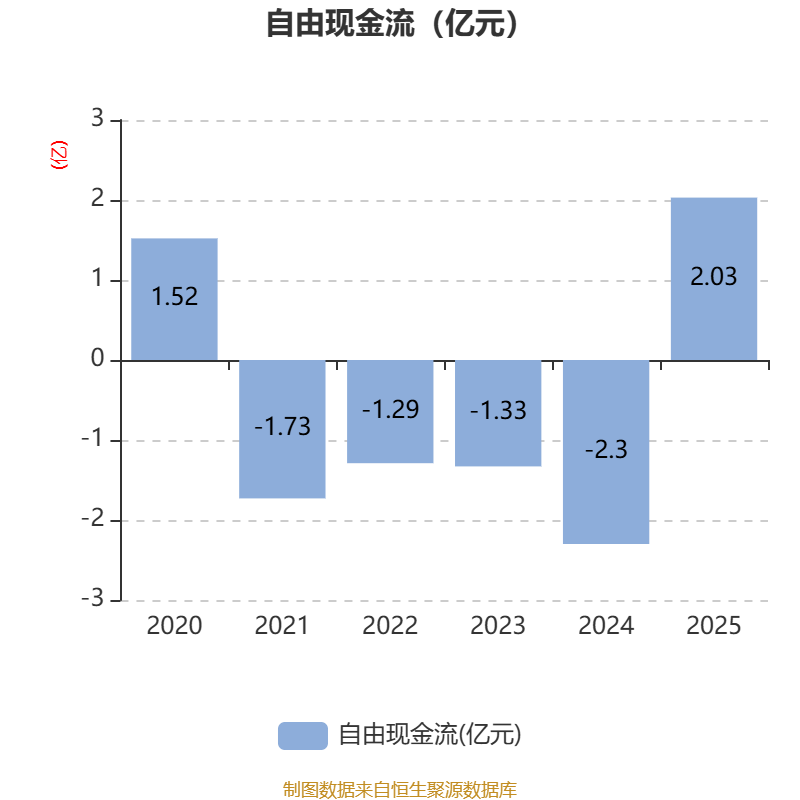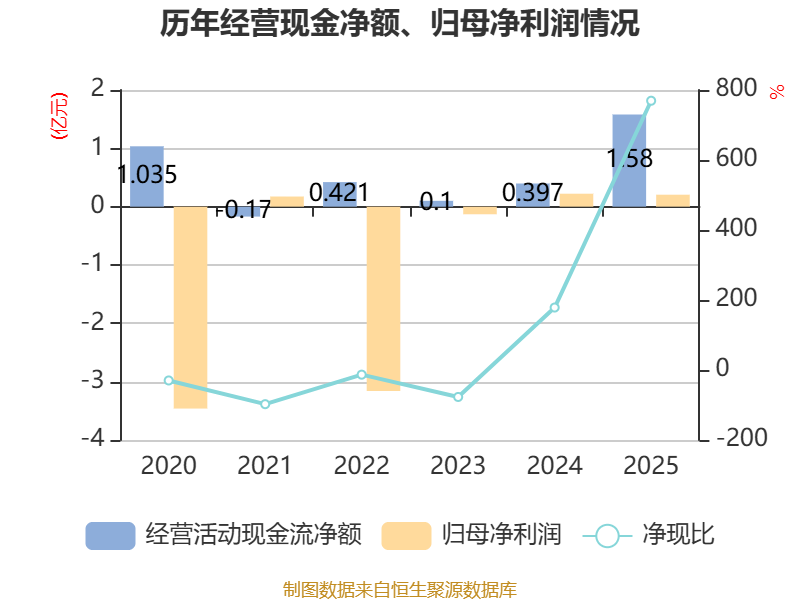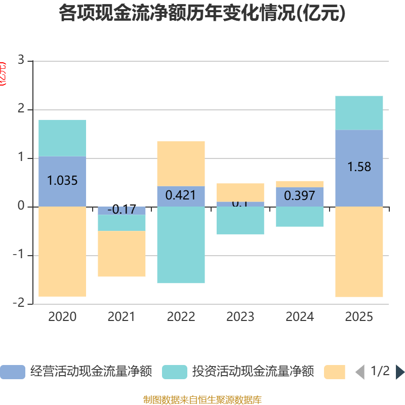 截至2025年,公司经营活动现金流净额为1.58亿元,同比增长298.53%;筹资活动现金流净额-1.86亿元,同比减少1.99亿元;投资活动现金流净额6951.74万元,上年同期为-4140.85万元。