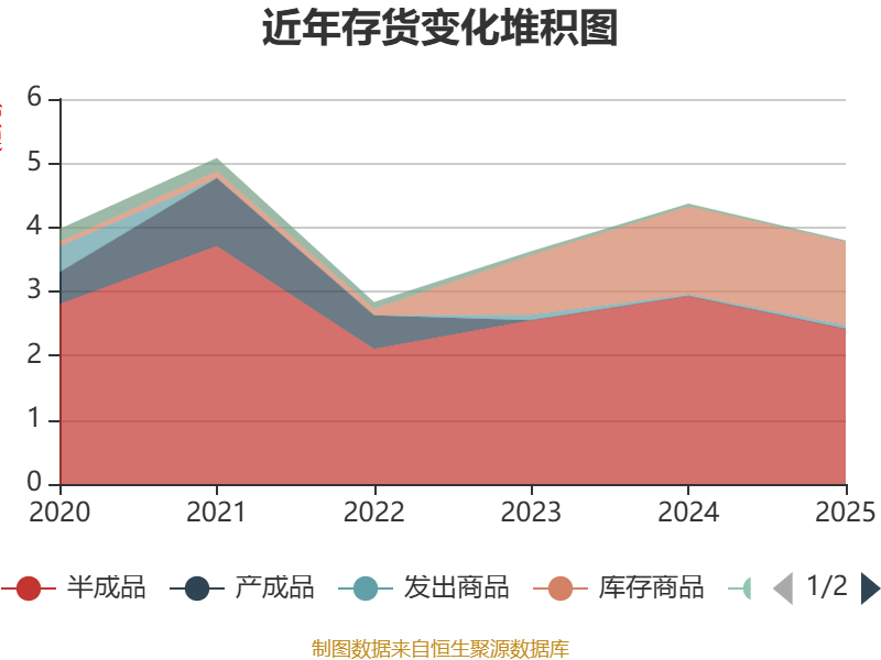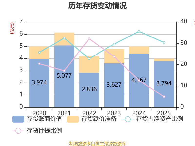 从存货变动来看,截至2025年末,公司存货账面价值为3.79亿元,占净资产的30.37%,较上年末减少5726.31万元。其中,存货跌价准备为1947.4万元,计提比例为4.88%。