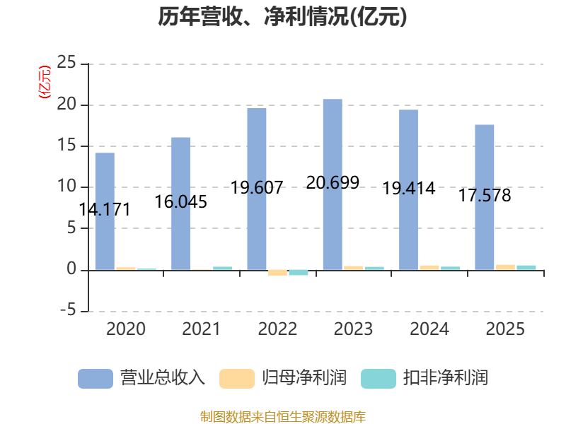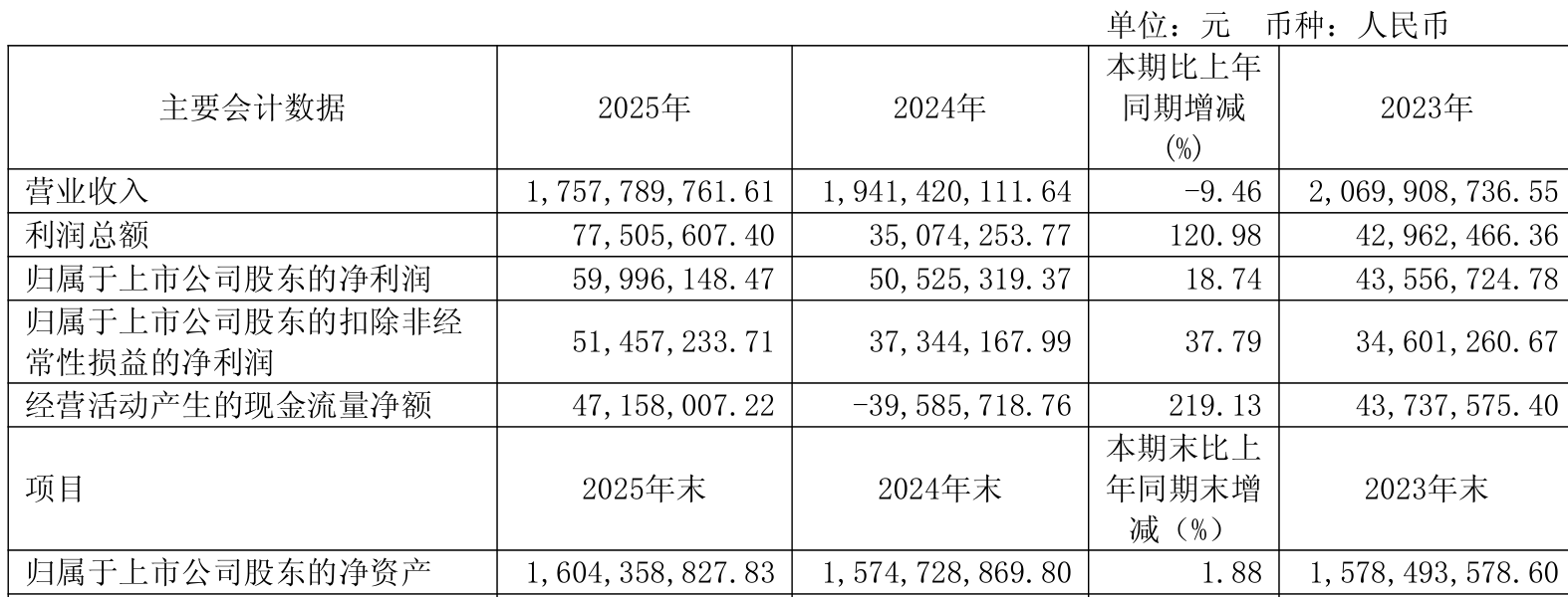 中证智能财讯太龙药业(600222)4月15日披露2025年年度报告。2025年,公司实现营业总收入17.58亿元,同比下降9.46%;归母净利润5999.61万元,同比增长18.74%;扣非净利润5145.72万元,同比增长37.79%;经营活动产生的现金流量净额为4715.8万元,上年同期为-3958.57万元;报告期内,太龙药业基本每股收益为0.1085元,加权平均净资产收益率为3.74%。