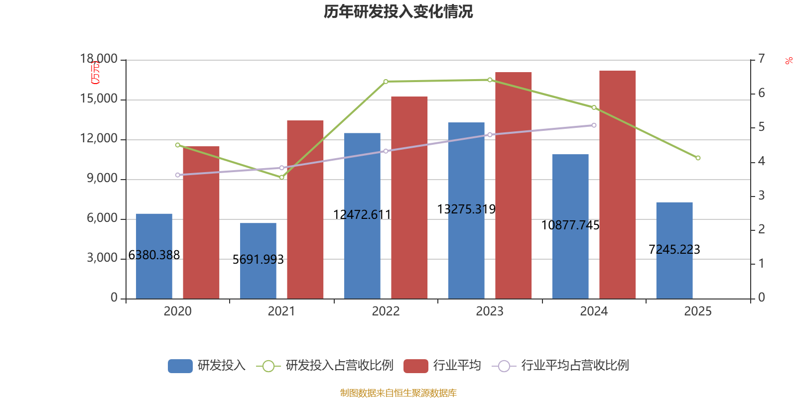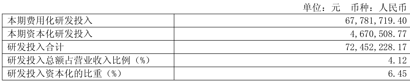 2025年全年,公司研发投入金额为7245.22万元,同比下降33.39%;研发投入占营业收入比例为4.12%,相比上年同期下降1.48个百分点。此外,公司全年研发投入资本化率为6.45%。