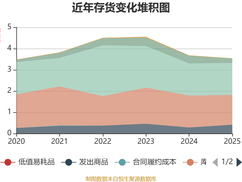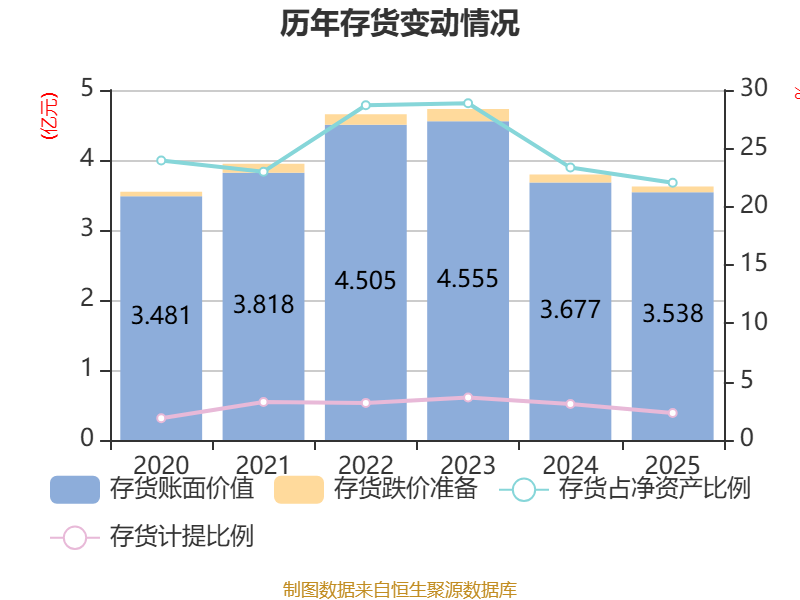 从存货变动来看,截至2025年末,公司存货账面价值为3.54亿元,占净资产的22.05%,较上年末减少1384.63万元。其中,存货跌价准备为836.1万元,计提比例为2.31%。