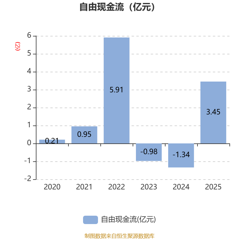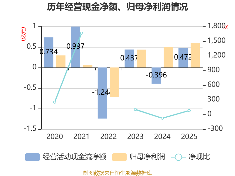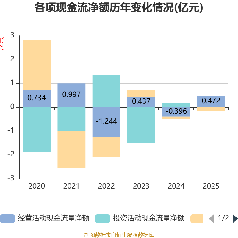 截至2025年,公司经营活动现金流净额为4715.8万元,同比增加8674.37万元;筹资活动现金流净额-1536.65万元,同比减少559.07万元;投资活动现金流净额16.08万元,上年同期为1825.1万元。
