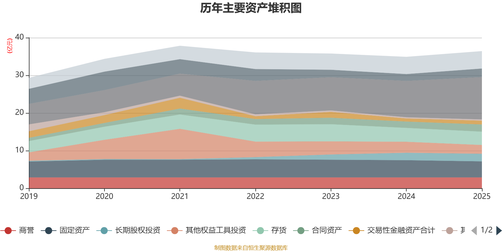 资产重大变化方面,截至2025年末,公司应收票据及应收账款较上年末增加16.48%,占公司总资产比重上升3.22个百分点;其他权益工具投资较上年末减少20.29%,占公司总资产比重下降1.98个百分点;固定资产较上年末减少6.66%,占公司总资产比重下降1.38个百分点;货币资金较上年末增加24.19%,占公司总资产比重上升0.98个百分点。