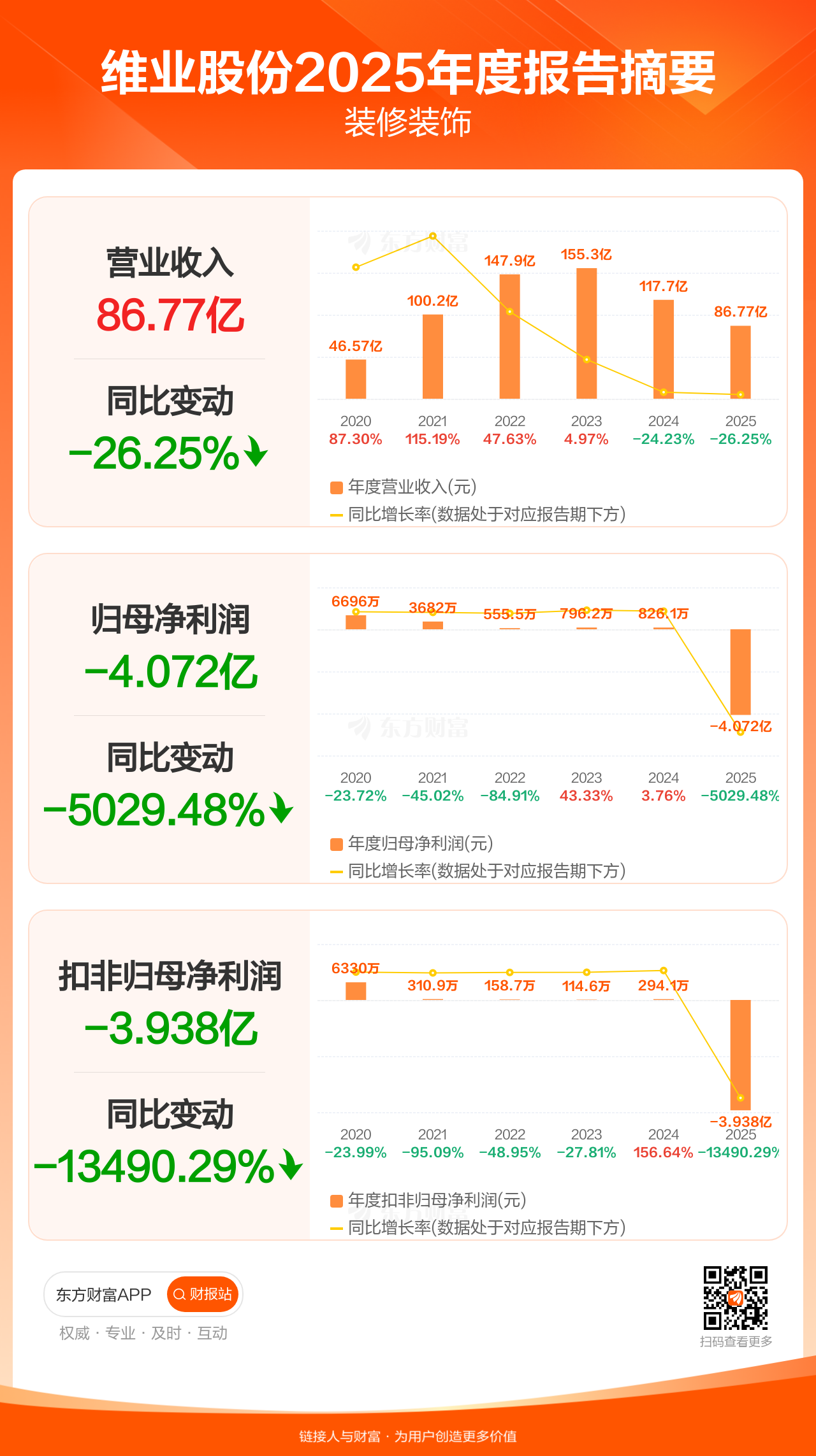 维业股份4月15日发布2025年年报显示,公司全年实现营业收入86.77亿元,同比下滑26.25%;归母净利润-4.07亿元;扣非归母净利润-3.94亿元。