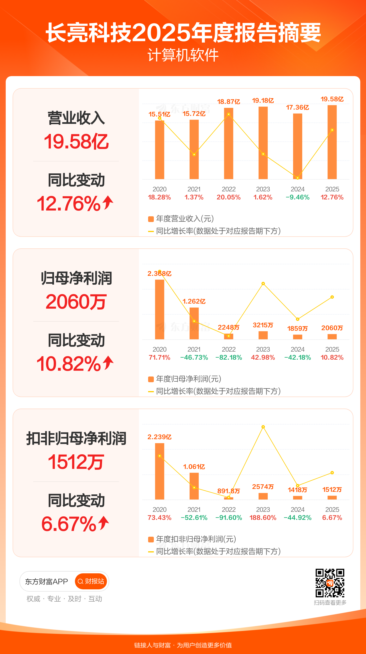 长亮科技4月15日发布2025年年报显示,公司全年实现营业收入19.58亿元,同比增长12.76%;归母净利润2059.67万元,同比增长10.82%;扣非归母净利润1512.07万元,同比增长6.67%。