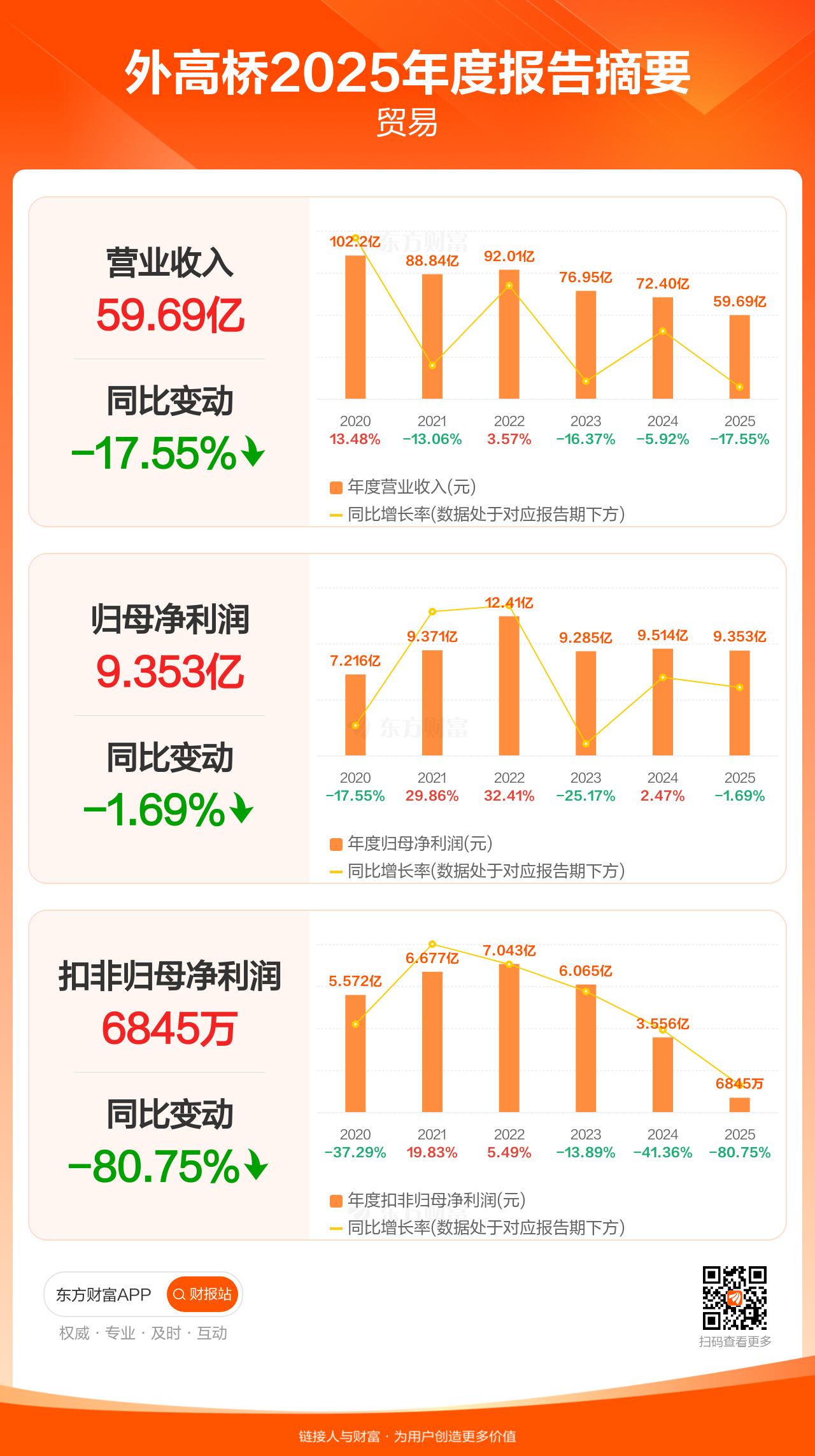 外高桥4月15日发布2025年年报显示,公司全年实现营业收入59.69亿元,同比下滑17.55%;归母净利润9.35亿元,同比下滑1.69%;扣非归母净利润6844.95万元,同比下滑80.75%。