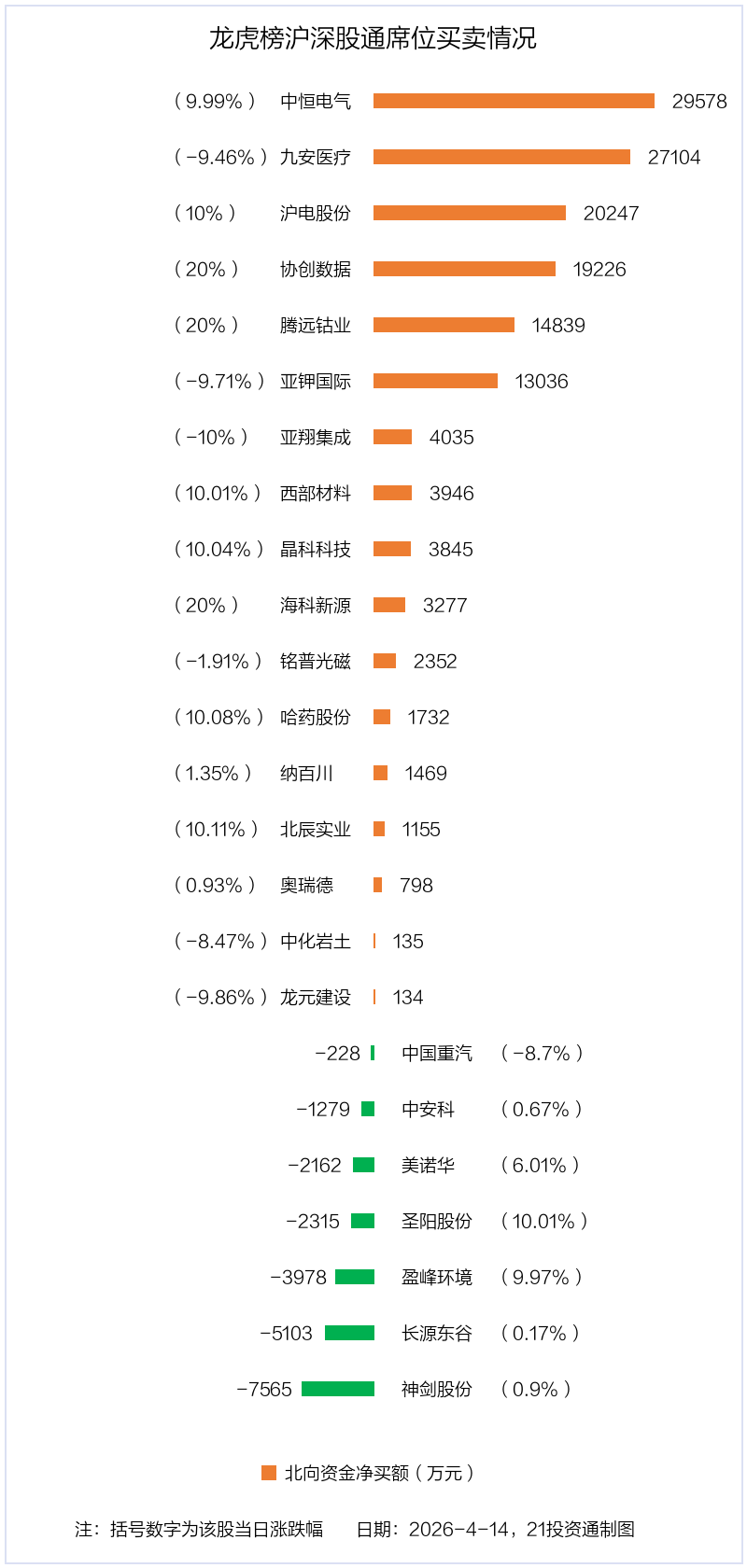 4月14日,北向资金参与龙虎榜中的个股共有24只,合计净买入12.43亿元。其中沪股通净买入6股,净卖出3股,合计净买入3154.53万元;深股通净买入11股,净卖出4股,合计净买入12.11亿元。