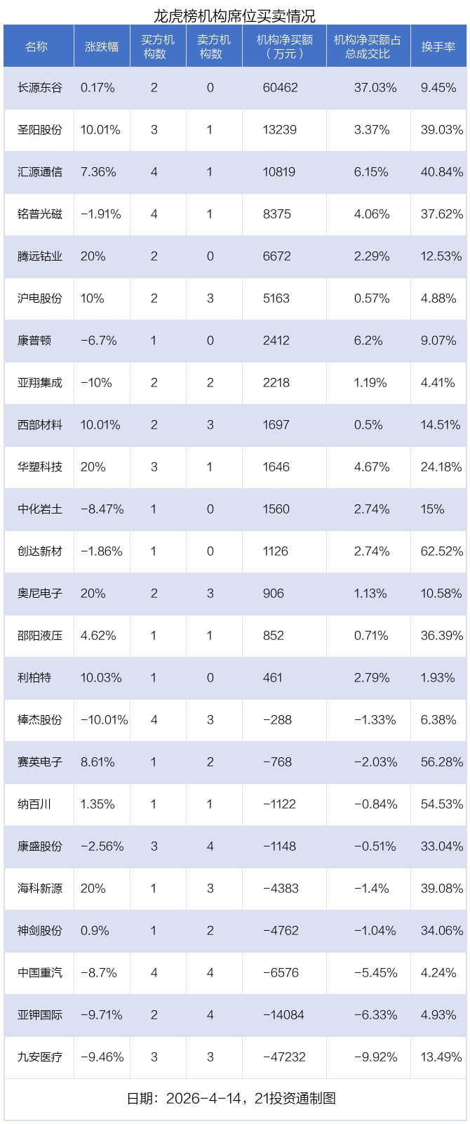 其中,机构净买入金额最多的是长源东谷(603950.SH),当日收盘上涨0.17%,换手率为9.45%。