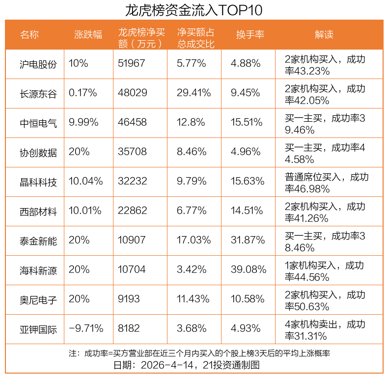 4月14日,上证指数上涨0.95%,深证成指上涨1.61%,创业板指上涨2.36%。盘后龙虎榜数据显示,共有44只个股因当日异动登上龙虎榜,资金净流入最多的是沪电股份(002463.SZ),达5.2亿元。