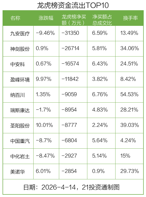 而龙虎榜中资金净流出最多的是九安医疗(002432.SZ),被净卖出为3.13亿元,占总成交金额的6.59%。九安医疗收盘下跌9.46%,换手率为13.49%。