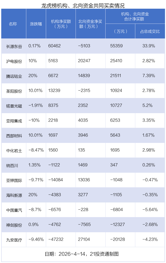 4月14日,24只个股龙虎榜出现了机构的身影,机构合计净买入3.72亿元。具体来看,机构净买入15股,净卖出9股。