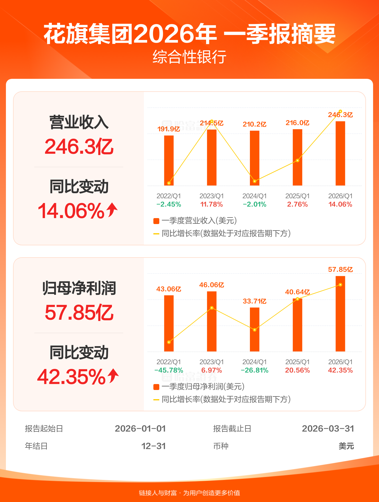 花旗集团4月14日发布一季报业绩,截至2026年3月31日的3个月内,该公司营业收入246.33亿美元,同比增长14.06%;公司权益持有人应占溢利(归母净利润)57.85亿美元,同比增长42.35%。