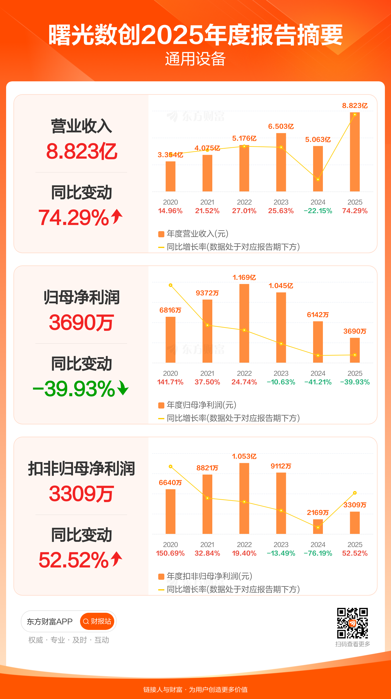 曙光数创4月14日发布2025年年报显示,公司全年实现营业收入8.82亿元,同比增长74.29%;归母净利润3689.77万元,同比下滑39.93%;扣非归母净利润3308.61万元,同比增长52.52%。