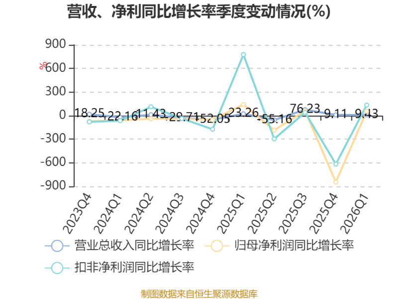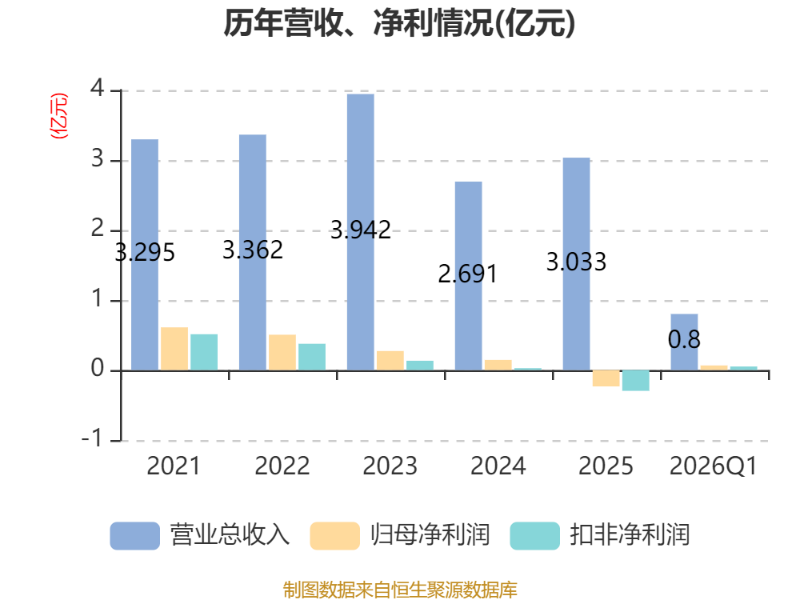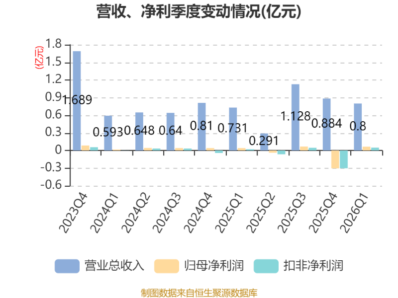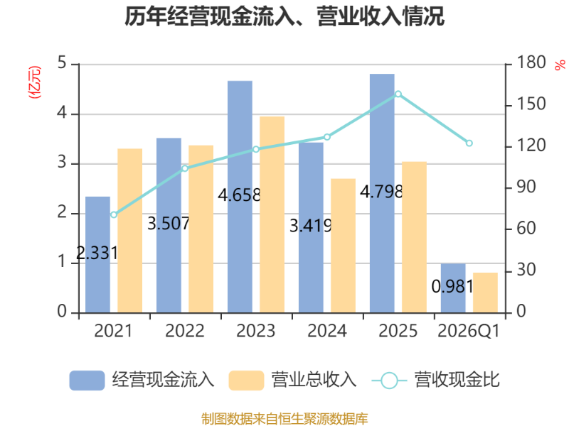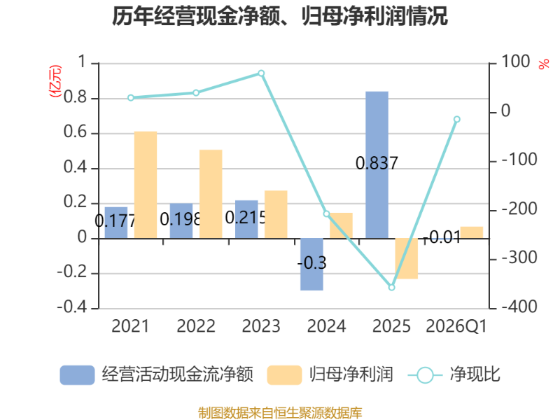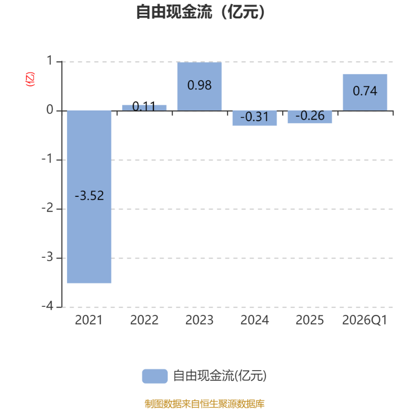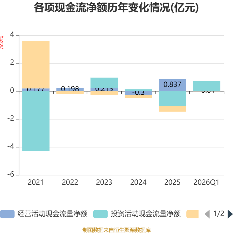 截至2026年一季度末,公司经营活动现金流净额为-96.11万元,同比增加4920.07万元;筹资活动现金流净额-173.86万元,同比增加1726.14万元;投资活动现金流净额6957.32万元,上年同期为5147.22万元。