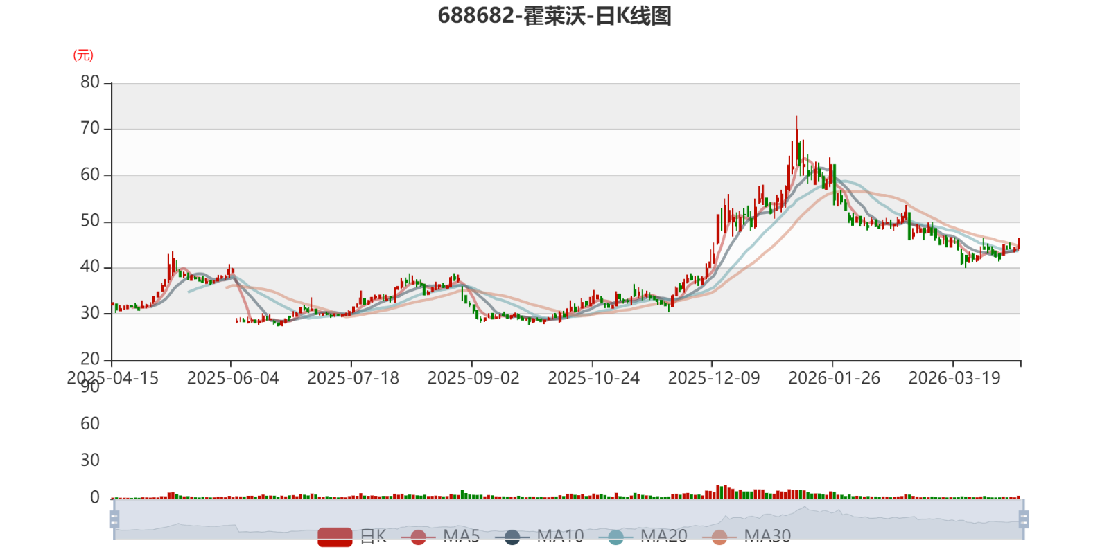 以4月14日收盘价计算,霍莱沃目前市盈率(TTM)约为-224.28倍,市净率(LF)约7.64倍,市销率(TTM)约15.22倍。